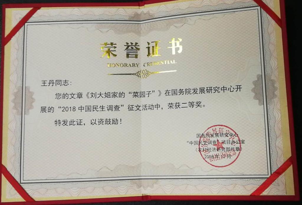 近日,会计系王丹老师的文章《刘大姐家的“菜园子”》在国务院发展研究中心开展的“2018中国民生调查”征文活动中荣获二等奖。