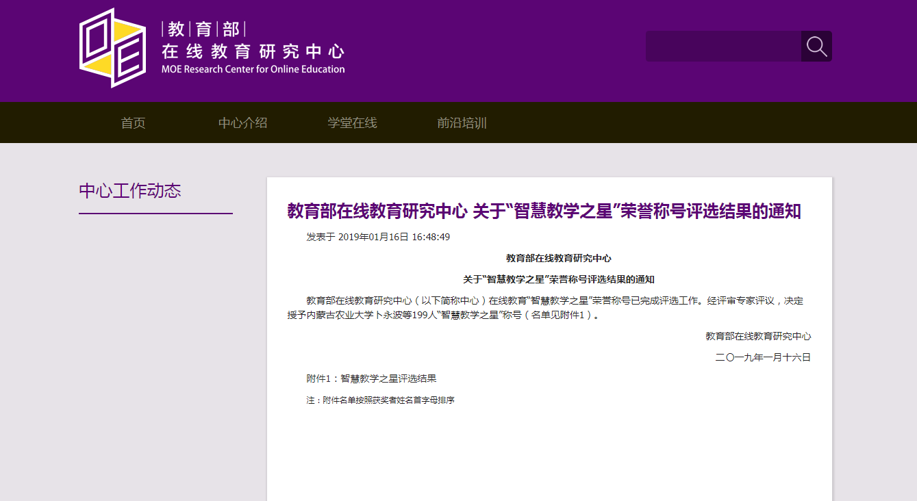 为推动在线课程建设与应用,加快信息化与高等教育的融合,教育部在线教育研究中心于2018年11月开展“智慧教学之星”荣誉称号的评选工作,以表彰在智慧教学领域中做出突出成绩的优秀教师。