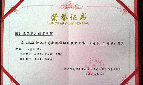 2012年浙江省高职院校网络技能大赛暨“H3C”杯全国大学生网络技能大赛浙江赛区选拔赛获奖名单公布。在我院计算机与信息技术系龚追飞、罗黎霞、张丽虹、杨淑贞四位老师带领下,计算机网络技术专业张贝利、沈洁洁、王强兴,胡晨、丁麒攀、林超六位同学组成的两支代表队均获得三等奖。