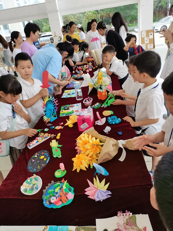 为庆祝建党一百周年和“六·一国际儿童节”,同学们精心准备了上百幅美术和手工作品,有素描、油画、水彩画、蜡笔画、儿童创意画、风景画、黑白装饰画、剪贴画、剪纸、折纸、超轻粘土捏塑等等。活动现场,同学们带领着小朋友们一一观看,并细心地为她们解说,小朋友们对精美的美术与手工作品赞不绝口,纷纷驻足观看,开心地和同学们交流自己喜爱的卡通人物和作品,其中用超轻粘土制作的创意手工作品“镜子”“保护海洋生物”“八大行星”和剪纸作品“建党百年”“十二生肖”等非常受小朋友们的欢迎。
