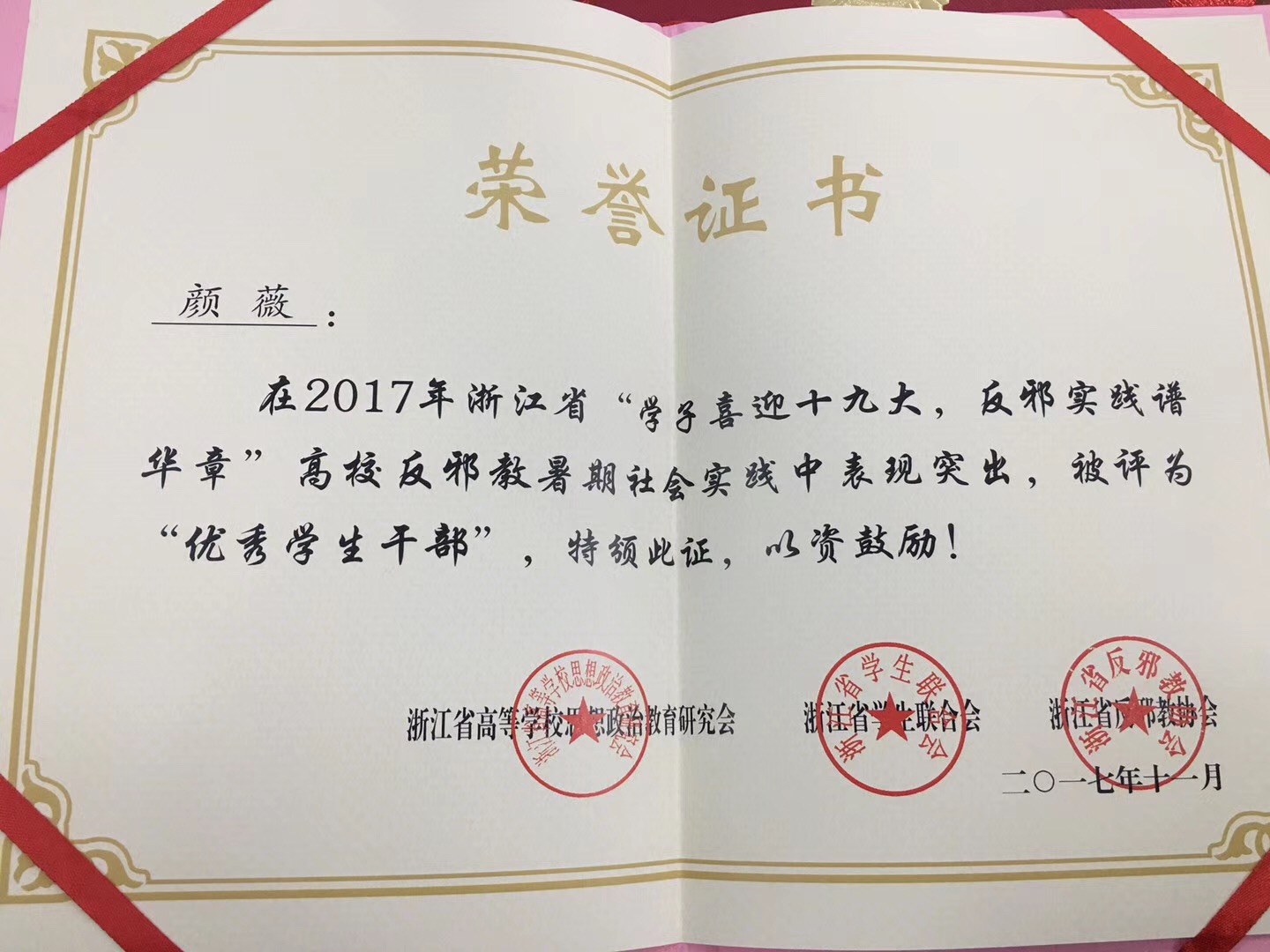 颜薇被评为优秀学生干部颜薇被评为优秀学生干部
