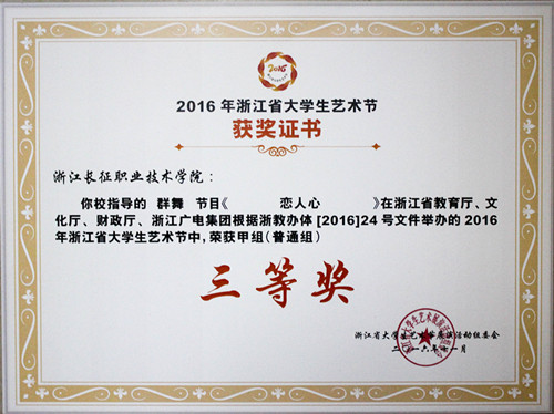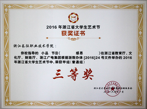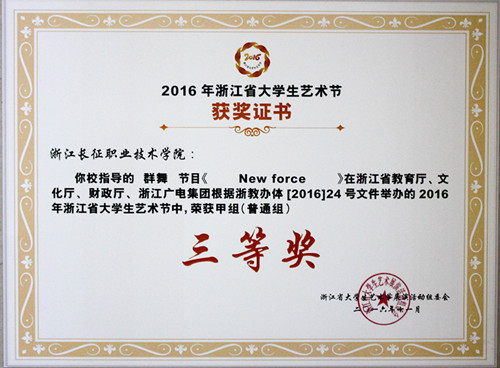 在省教育厅、省文化厅、省财政厅、浙江广播电视集团共同主办的2016年省大学生艺术节中,我院选送的小品《感恩》荣获戏剧类甲组三等奖;群舞《New force》、《恋人心》、《我们的故事》等3个节目荣获舞蹈类甲组三等奖。(团委供稿)