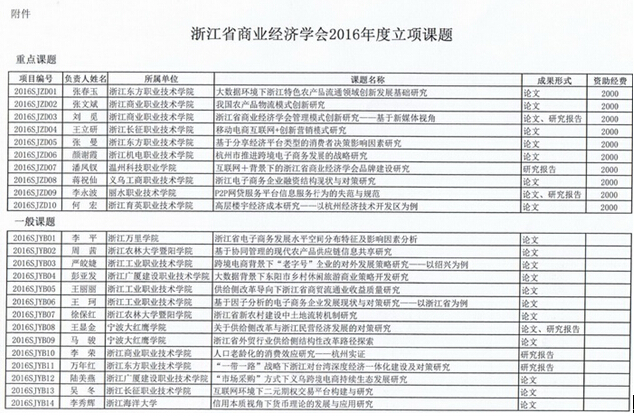 接浙江省商业经济学会 浙商经会【2016】6号文件:《浙江省商业经济学会关于公布2016年度立项课题的通知》我校王立研、吴冬两位老师获得课题立项。