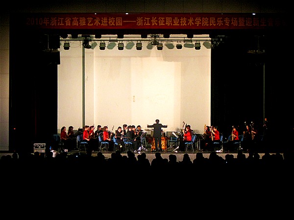 演出开始之前,由贺旭辉教授致了开幕词,对浙江省歌舞剧院民族乐团的到来表示了热烈的欢迎和衷心的感谢,希望广大学子能在享受高雅艺术的同时获得熏陶,更希望广大同学们树立远大的理想和信念,树立正确的世界观、人生观、价值观和荣辱观,养成良好的道德情操和高尚的思想品德,努力把自己培养成为优秀人才,迎接时代的挑战。